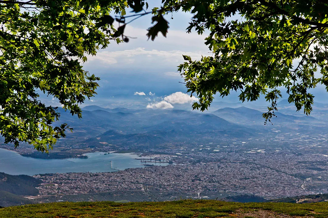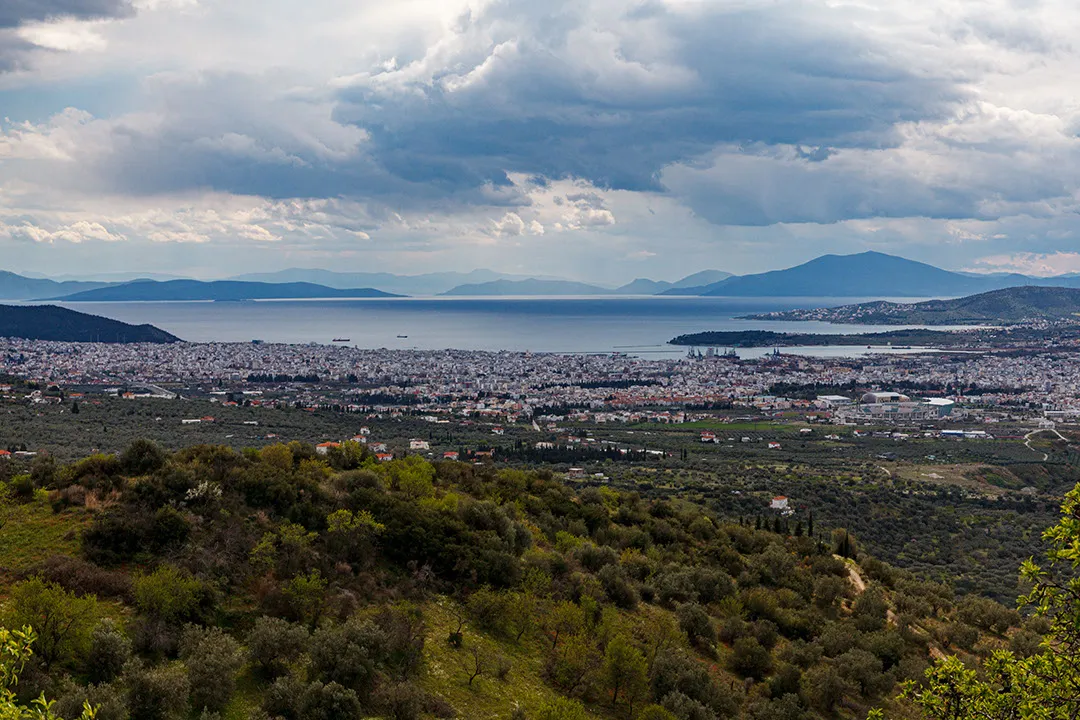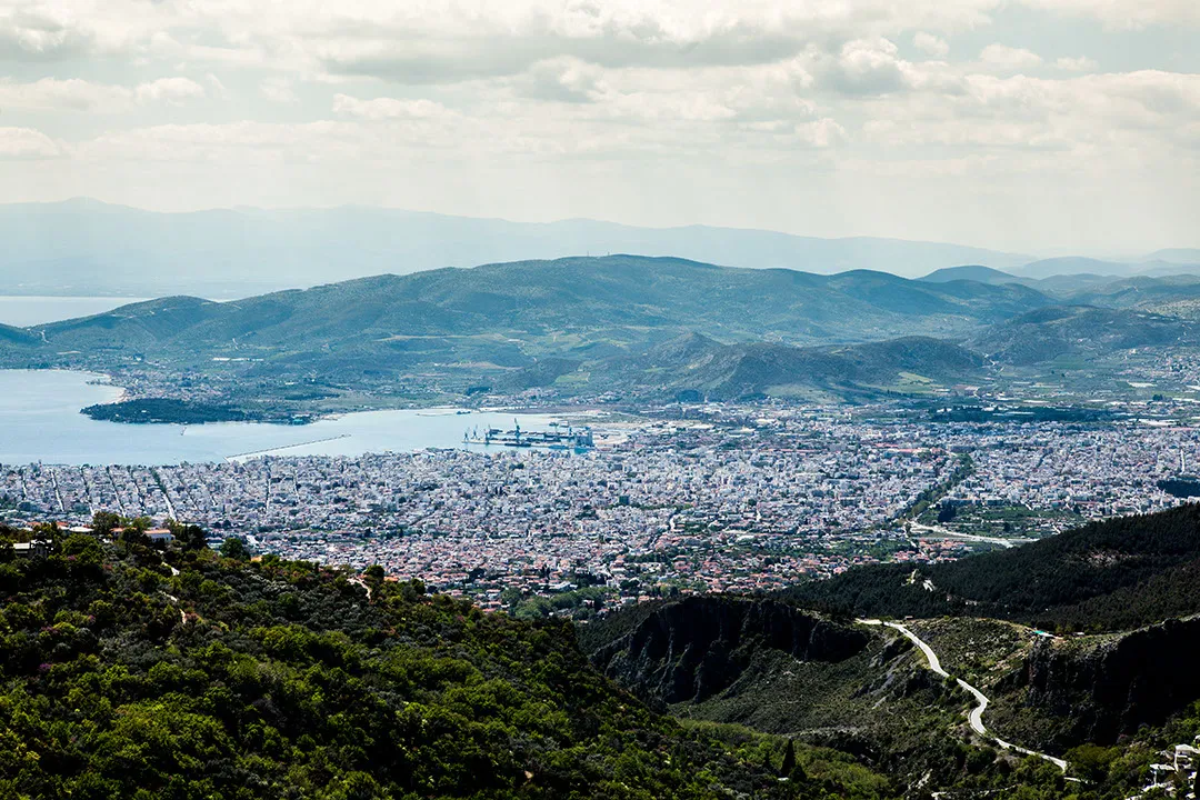 ερείπια αρχαίας πόλης στον λόφο της Γορίτσας και στο βάθος ο Βόλος
